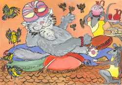 Развалясь на подушках, Мясяо лежит, наблюдает...